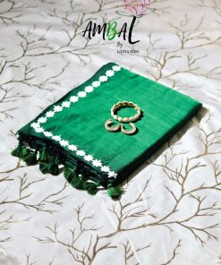 Green cotton saree with lays border without a blouse piece – Make a graceful statement with this elegant handwoven emerald green saree. Crafted from soft, breathable fabric, this saree features a stunning white floral lace border that runs along the edge, adding a touch of femininity and charm.